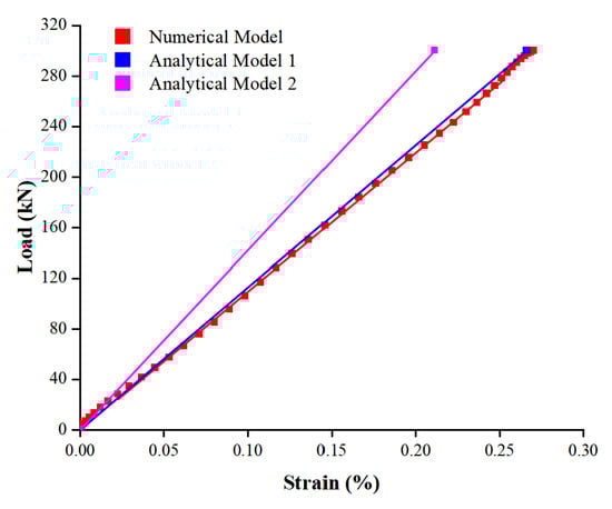 The axial displacement U3 of reference point RP1 of the numerical model was extracted to obtain the axial load–strain relationship of the pipe, as shown in Figure 19; thus, the axial tensile stiffness of the pipe can be obtained via linear fitting. Additionally, Equation (18) was used to calculate the axial tensile stiffness of the pipe. In analytical model 1, the radial compression of the pipe was considered; thus, . In analytical model 2, the radial compression of the pipe was not considered; thus, (Equation (18)).