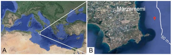 Location of the sampling site in the coralligenous bottoms in the western Ionian Sea: (A) within the Mediterranean Sea, and (B) right ESE of the Marzamemi village.