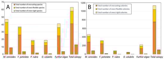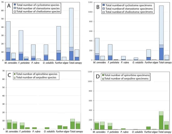 The highest number of species with living colonies (48) occurred on M. cereoides, and most of them (29) were shared with F. petiolata and other constituents of the canopy. Further 7 species were shared with other algae, and 11 were only found on M. cereoides. Among them Bugulina cf. fulva (Figure 6C), with 6 colonies, was the most abundant. In contrast, out of the 18 species never found on M. cereoides, 4 occurred only on F. petiolata, each with 1 to 4 colonies.