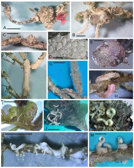 - Liuzzi, M.G.; Lopez-Gappa, J. Algae as Hosts for Epifaunal Bryozoans: Role of Functional Groups and Taxonomic Relatedness. J. Sea Res. 2011, 65, 28–32. [Google Scholar]