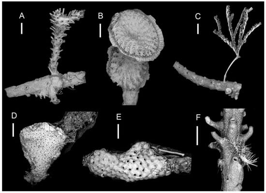 Several bryozoans have often been considered relevant habitat-formers able to create 3D structures, enhancing habitat structural complexity and promoting biodiversity (e.g., Wood et al., 2012 [1]; Lombardi et al., 2014 [2]; Lombardi et al., 2020 [3]). Studies have especially been devoted to “frame builders”, i.e., species with robust skeletons developing large-sized colonies and able to produce bioconstructions by growing on each other and/or fusing their branches (see [1]; Cocito, 2004 [4] for a review). In the Mediterranean Sea, data mostly refer to Pentapora fascialis (Pallas, 1766) and Schizoporella errata (Waters, 1878) ([2,4]; Holon & Harmelin, 2013 [5] and references therein). Both species typically develop large colonies of some dm in diameter and height and exceptionally up to 80-100 cm, branched hemispherical or massive with irregular digitations, respectively (Novosel, 2005 [6]; Cocito et al., 2006 [7]; AR personal observations). Colonies often coalesce to form monospecific bioconstructions supporting high biodiversity. Pentapora fascialis from 8–22 m depth in the Ligurian Sea, hosted 84 species, including 27 bryozoans and 2 serpulids (Ferdeghini & Cocito 1999 [8]). A lower number of epibionts (36 species, including 4 bryozoans and 3 serpulids) has been reported for S. errata from 0.3–2 m depth in the same area [8], and even fewer species (28, including 5 bryozoans and 1 serpulid) were observed on colonies from Minorca examined by Maluquer (1985) [9]. High biodiversity figures have also been reported for other species with erect-rigid skeletons developing cm- to dm-sized colonies, i.e., Myriapora truncata (Pallas, 1766), Smittina cervicornis (Pallas, 1766) and Reteporella couchii couchii (Hincks, 1878), supporting a total of 22, 28 and 37 species, respectively (Cocito, 2009 [10]).