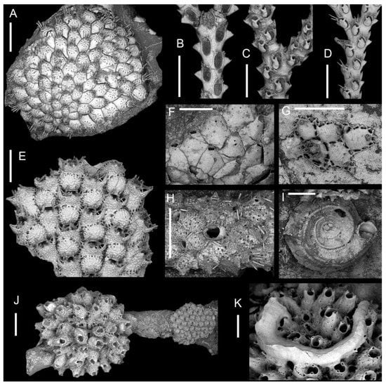 - Taylor, P.D. Bryozoan Paleobiology; John Wiley & Sons: Hoboken, NJ, USA, 2020; ISBN 1118455002. [Google Scholar]