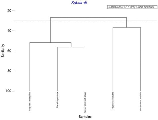 Notwithstanding the relatively low differentiation of algal basibiont morphologies and the single sample and site, in the examined situation, epibiont species richness was comparably higher (63 bryozoans) and differences between substrata more remarkable. This is also indicated by the statistical analysis (Figure 8) that groups more tightly P. rubra and O. volubilis, the two substrata with the lower relevance of both bryozoan and serpulid epibionts. This comparably low occurrence of epibionts could be related to the possible presence of antifouling substances produced by these algae, discouraging epibiont settlement (see Ryland, 1959 [39]; Steinberg and de Nys, 2002 [40]).