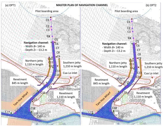 Master plan of navigation channel with two design alternatives of jetties (a) OPT1 Plan, (b) OPT2 Plan.