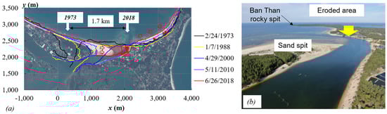 (a) Cua Lo sand spit elongation over period 1973–2018, (b) location of the elongated sand spit and eroded area.