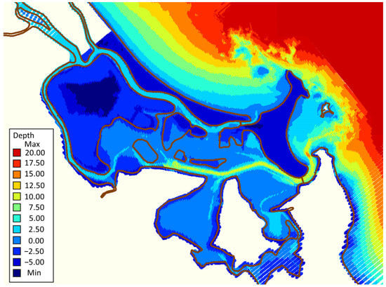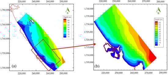 Topography map with the scale of 1/10,000 for the study area is collected from Department of Survey, Mapping and Geographic Information Vietnam–Ministry of Natural Resources and Environment. Bathymetry data of Cua Lo estuary and its adjacent area with the scale of 1/5000 and 1/2000 surveyed in 2019 and 2020 are collected from the bilateral project between Vietnam and Japan [10] (Figure 4). In addition, the bathymetry data for offshore area is obtained from GEBCO’s gridded bathymetric data sets [9,11].
