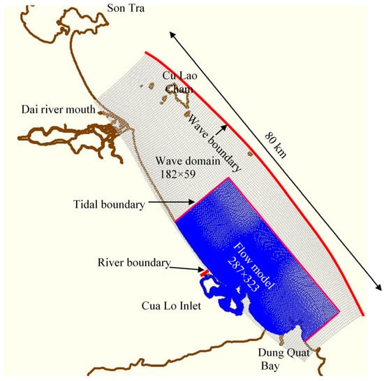 A coupled model has been developed for the study area, incorporating both the wave and flow models. The computational domain of the coupled model consists of two nested numerical grids generated by Delft3D-RGFGRID module (Figure 6). The larger domain is established for the wave model (Delft3D-WAVE module), covering nearly 80 km from the north shore of Cua Dai estuary to the end of Dung Quat Bay with the area of 3000 km2. This domain consists of 182 × 59 grid cells with the sizes varying from 300 m to 600 m. As the wave enters shallower regions, it is profoundly influenced by the local bathymetry and geometry. Therefore, the finer model domain is established for the flow model (Delft3D-FLOW module) surrounding the area of Cua Lo, including the Truong Giang and Tam Ky river systems, in order to better determine the actual local wave characteristics as well as fully consider the interaction between the river and the sea. The finer domain encompasses an area of approximately 500 km2, comprising 287 × 323 grid cells, with the smallest size of 10 m (e.g., within the estuary area, along the coast and in An Hoa lagoon), and their sizes gradually increase toward the sea.