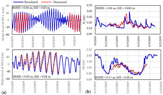 The calibration and validation processes of the coupled model are performed by using the surveyed wave and water level data during the summer (in August 2019) and winter (in November 2019) periods (see Section 2.1.3). Two statistical parameters, i.e., Root Mean Square Error (RMSE) and Mean Error (ME), are adopted to evaluate the performance and reliability of the model. Figure 8 shows that the simulated water level and wave height fit quite well with the observed data in terms of both magnitude and phase. The wave model satisfactorily captures the time variation of wave height during the Northeast monsoon in November 2019. Even though the time variations of wave height in August 2019 survey are not reproduced well, the model results are still satisfactory since the obtained RMSE and ME values are sufficiently small. The RSME values for the water level at TGR1, TGR2 stations and wave heights at SMS station are 0.04 m, 0.05 m, 0.06 m, and 0.11 m, respectively, while their ME values are 0.03 m, 0.04 m, 0.045 m, and 0.05 m, respectively. Thus, this well-calibrated and validated coupled model is reliable to be adopted for next simulation steps.