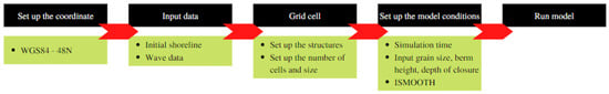 Mathematical modeling is the most useful method for the prediction of coastal change at all time and space scales [26]. Among the shoreline change models, the one-line model is commonly used to evaluate and predict the evolution of the long-term shoreline change, including the effects of constructions and other measures on the coastline [27]. Anastasiou and Sylaios [28] predicted the shoreline change in the Nestos River Delta, Greece, using LITPACK model and stated that the model showed fair agreement to remote sensing analysis over 31 years. Yan Ding et al. [29] used a newly developed one-line model GenCade to simulate shoreline changes along the Delaware Coast and showed a good agreement between simulated and observed shorelines. Sung-Chan Kim et al. [30] adopted and compared two wide-used one-line models, i.e., LITPACK and GenCade, through a series of simplified test cases to the analytical solution. The results reveal that both models give good agreement with the analytical solutions. However, the GenCade model allows for user-specified, time-series beach placements starting after the simulation start time and assuming wave diffraction for groins, thereby helping the results from GenCade give more accurate results in predicting shoreline change. Townsend et al. [31] used three one-line models, i.e., LITPACK, UNIBEST, and GenCade, to evaluate the evolution of shoreline position. The authors stated that the GenCade model has internal models of wave diffraction, and an inlet bypassing capability and an inlet reservoir model for the calculation of shoal and inlet feature sediment balance.