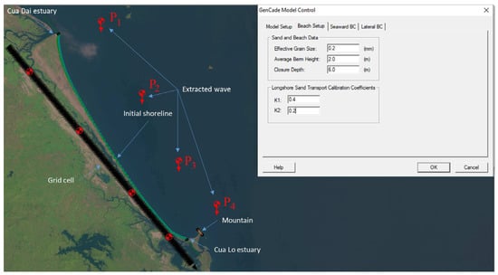 Figure 9 illustrates the main steps to set up and run the GenCade model. Firstly, the input conditions and parameters need to be defined and assigned (Figure 10). The initial coastline from Cua Dai estuary to Cua Lo estuary (green line) is extracted from Landsat 5 image on 10 March 2005 by applying the method proposed by Quang et al. [6,7]. The coastline from Cua Dai estuary to Cua Lo estuary is divided into 3124 cells (black line) with the size of 15 m. The offshore wave boundary conditions are introduced at four points, i.e., P1 (108.485°; 15.903°), P2 (108.564°; 15.777°), P3 (108.635°; 15.675°), and P4 (108.709°; 15.581°), at the water depth of 30 m; those are extracted from the wave model for the area of Quang Nam coast for period 2000–2020. Sand and beach data are assigned with the values of 0.2 mm, 2 m, and 6 m for the effective grain size, berm height Db, and closure depth Dc, respectively (see Section 2.1.4). The choice of longshore sand transport calibration coefficients K1 and K2 is described hereafter.