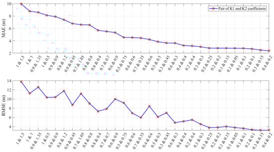 The empirical coefficients K1 and K2 in GenCade model play a crucial role in evaluating and predicting the shoreline change in the long-term period [34]. Based on modeling experience, Hanson and Kraus [35] recommended 0 < K1 < 1 and 0.5 K1 < K2 < 1.5 K1. In this study, 30 pairs of empirical coefficients K1 and K2 (red circles) have been tested to select the most suitable values of K1 and K2 for the study area by comparing the simulated shorelines with the actual shoreline. More precisely, GenCade model simulates the shoreline change from 2005 to 2010 using the “Initial shoreline” in 2005 (green line in Figure 10); then, its simulated shoreline is compared with the actual shoreline extracted from the Landsat 5 image on 24 March 2010. The results reveal that the most suitable coefficients K1 and K2 for the Quang Nam coast are 0.4 and 0.2, with the values of MAE (Mean Absolute Error) and RMSE being 2.39 m and 3.22 m, respectively (Figure 11).