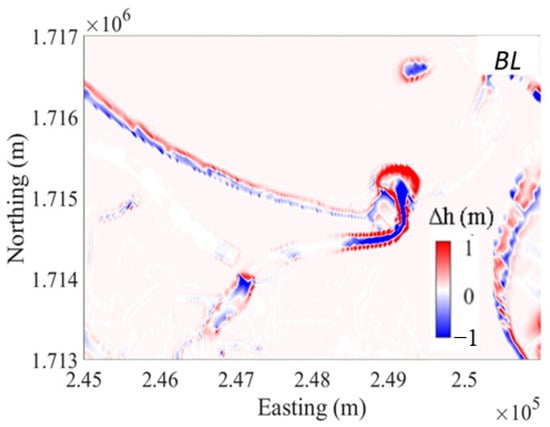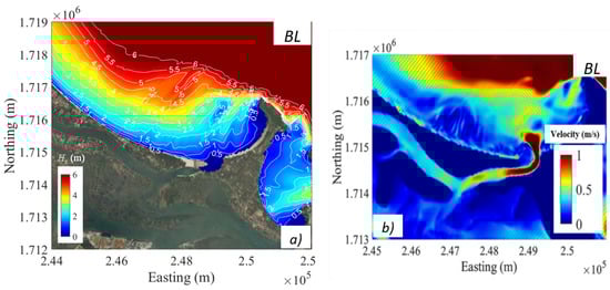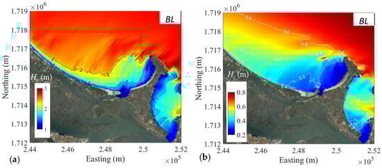 Figure 12 shows the results of wave height during the Northeast and Southeast monsoons under current condition (BL—Baseline). In the Northeast monsoon, the wave distribution in the inlet area and its Northern and Southern sides are markedly different. More specifically, the wave height in the Northern part of Cua Lo area can reach up to 2 m before the wave breaks, while at the inlet, the wave height ranges from 1.0 m to 1.5 m. In the Southern part of Cua Lo estuary, Ban Than cape and coral reefs have a great influence on wave propagation where the wave height is under 0.5 m, and the waves break quite far from the shore. During the Southeast monsoon, the wave height is relatively small compared to the Northeast monsoon period, e.g., around 0.2–0.4 m in the area of Cua Lo. The study area is shielded by Ban Than cape and coral reefs, so it is quite calm during the Southeast monsoon period for all incoming wave scenarios.
