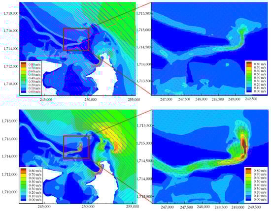 Figure 16a shows the maximum current field during the flood event in November 2017, which has the frequency of 5% [33]. The flood flow from Truong Giang and Tam Ky river systems pours into An Hoa lagoon and enters the sea through Cua Lo and Ky Ha estuaries (Figure 1). According to Tam et al. [10], the maximum discharge through Cua Lo estuary during the peak flood period in November 2017 is about 550 m3/s; meanwhile, its average discharge under normal conditions is about 450 m3/s. Under the flood condition, the maximum velocity at Cua Lo reaches up to 1.5 m/s on the right side of Tam Hai commune. Due to this high velocity, serious erosion on the right bank of Cua Lo occurs.