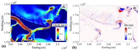 (a) Current field, (b) bed level changes in the area of Cua Lo after the flood event—BL scenario.
