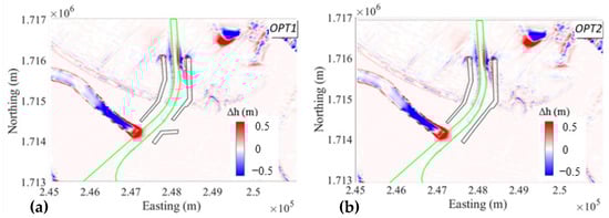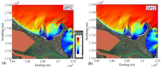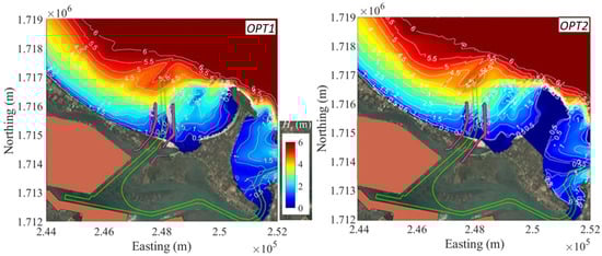 Figure 17 shows the largest wave field during the Northeast monsoon in the area of Cua Lo after the construction of the navigation channel according to OPT1 and OPT2 alternatives. The construction has changed the wave distribution compared to natural conditions, where the wave height between two jetties decreases from 1–2 m to only 0.25–1 m. However, the wave height behind the crest of the Southern jetty is still relatively high, i.e., of about 2 m.