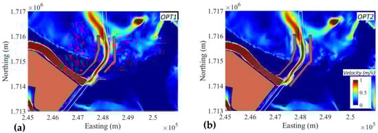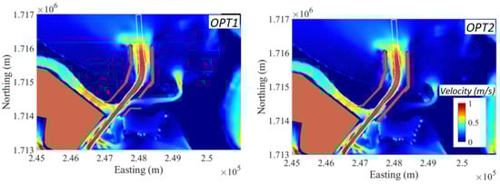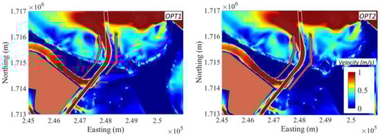 Figure 22 shows the maximum flow velocity during the flood event in November 2017 according to OPT1 and OPT2 alternatives. The flow velocity through the newly opened channel is very large with a maximum velocity of over 1.5 m/s. The flow range with high velocity from 1–1.6 m/s can reach 1.5–2 km outside the river mouth.