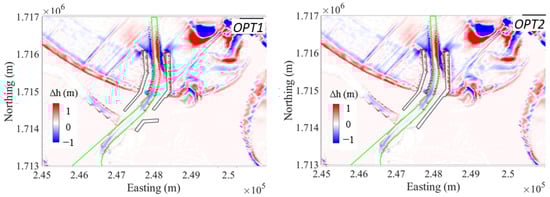 Figure 18 illustrates the current field during the Northeast monsoon after jetty construction. Under the OPT1 alternative, the flow mainly concentrates through the new navigation channel with the maximum velocity of being 0.5–0.7 m/s. Although the current Cua Lo inlet is closed under the OPT2 alternative, the flow velocity within the channel is not significantly different from the one under OPT1 alternative, of around 0.5–0.8 m/s. Figure 19 shows the bed level changes in one year after jetty construction. Due to the flow field contribution, the bed level change is mainly concentrated in the channel area.