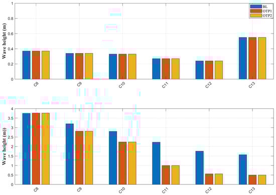 To assess the wave transformation features of the construction alternatives in comparison to current conditions, simulated wave height at several points along the channel (presented in Figure 2) are extracted. Figure 24 shows that there is no significant change in the wave height at points from C8 to C13 during the Southeast monsoon compared to the current conditions. However, the maximum wave height decreased by 20–30% compared to the current condition during the storm, particularly at points from C8 to C13, which are located downstream of the navigation channel.