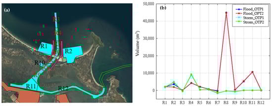 Figure 26b shows that the differences in seabed terrain changes according to OPT1 and OTP2 alternatives are minor, both under storm and flood conditions. Overall, floods primarily cause sedimentation in the R8 area, resulting in a volume of approximately 45,000 m3. Since this area is located at the confluence of the Truong Giang River and new navigation channel, sediment from upstream tends to accumulate at this zone. The total amount of sedimentation within the channel, i.e., the zones from R3 to R11, is about 68,000 m3 under a typical flood event in both construction alternatives. Conversely, storms cause seabed terrain changes primarily in the mouth of the channel, spanning from zones R3 to R5, and result in a total sedimentation volume of approximately 9000 m3.