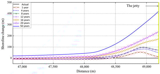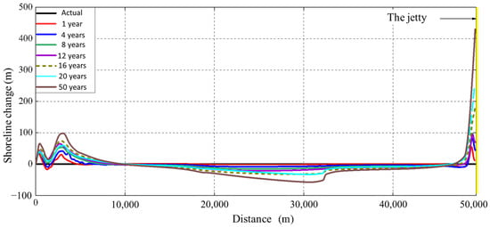The investigation of the shoreline evolutionary trend along 50 km sandy coast after the construction of two jetties under OPT2 alternative reveals that after 20-year and 50-year of operation, the northern coast adjacent to the Northern jetty reaches a distance of 250 m and 449 m towards the sea compared to the natural condition, respectively. This phenomenon stops only when sediment sources in the study area reach an equilibrium state. Since the sediment is trapped in the left region of the Northern jetty, the construction of jetties prevents the elongation of the sand spit as well as the deposition within the navigation channel.