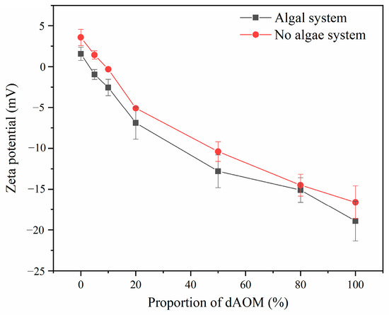 Zeta potential of MC in the algal and non-algal systems at different dAOM concentrations.