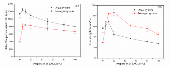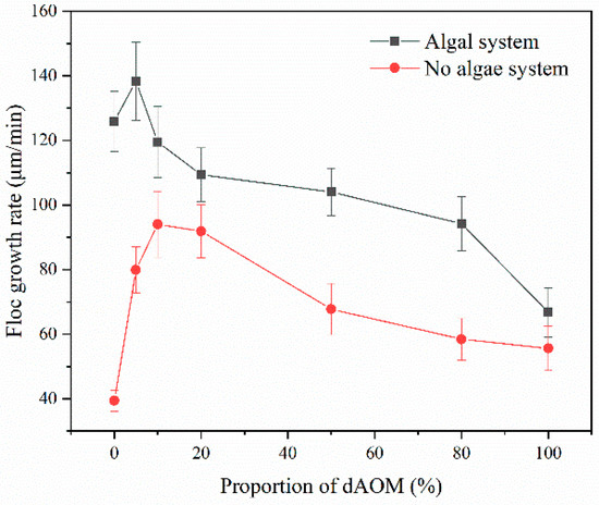 The growth rate of MC flocs formed in the presence of dAOM exhibited a similar propensity to expand and then decrease as dAOM concentration increased (Figure 3). The change trend was similar to those in floc particle size, strength, and regeneration. dAOM at low concentration promotes the MC flocculation process, accelerates floc formation, increases the speed at which MC creates stable flocs, and improves the flocculation effect; a high dAOM content inhibits the flocculation process, and the floc formation rate is slow, weakening the flocculation effect. Furthermore, because the presence of algal cells accelerates the binding of the cells or particles into aggregates [29], flocs grew quicker in the algal system than in the non-algal system.