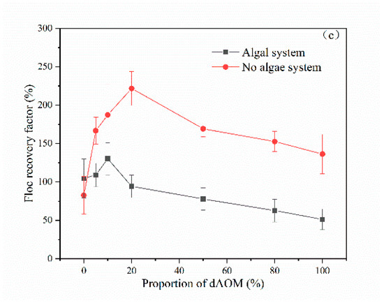 The dAOM produced by microalgal cells influences the size, strength, and regeneration of flocs formed by the MC during the flocculation process. At low dAOM concentrations, MC flocs have bigger particle sizes. However, as the dAOM concentration increases, the flocs progressively shrink; the same change pattern is shown in floc strength and regeneration (Figure 2). dAOM can increase the flocculation efficiency by establishing interparticle bridging or adhesion on the particle surface [24]. Similar studies have found that AOM operates as an auxiliary flocculant only at low doses and that it acts similarly to synthetic polymeric auxiliary flocculants, creating larger flocs [25].