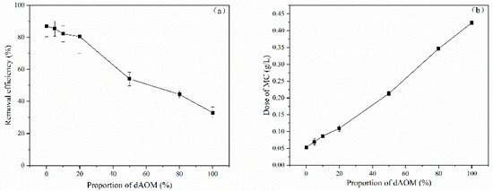 Removal efficiency of MC after three hours under different concentrations of dAOM (a), dosage of MC under different concentrations of dAOM at the same algal removal efficiency (80 ± 3%) (b).