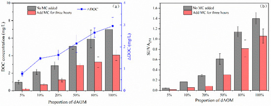 Changes in DOC content before and three hours after adding MC (a), change in SUVA254 in the system before and three hours after adding MC (b).