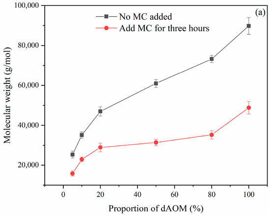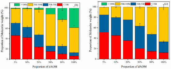With a variation range of 25,280–89,800 g/mol, the molecular weight rose as the dAOM concentration increased (Figure 6a). After three hours of MC flocculation, the system’s molecular weight fell considerably. For example, when the dAOM concentration was 100%, i.e., when the original algal liquid was utilized, the system’s molecular weight dropped from 89,800 g/mol to 48,820 g/mol. MC may significantly reduce the system’s molecular weight during the flocculation and algal removal procedures.