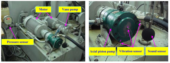 The bench of a swash plate plunger pump was used for fault simulation tests, as shown as Figure 9. It contained a Y132M-4 motor and an MCY14-1B axial piston pump with seven plungers. In the experiment, three types of sensors were installed: vibration sensors in three different directions, pressure sensor, and sound sensor. Data from different sensors were acquired. This research was conducted based on the analysis of pressure signals. We performed sampling with a frequency of 10 kHz.
