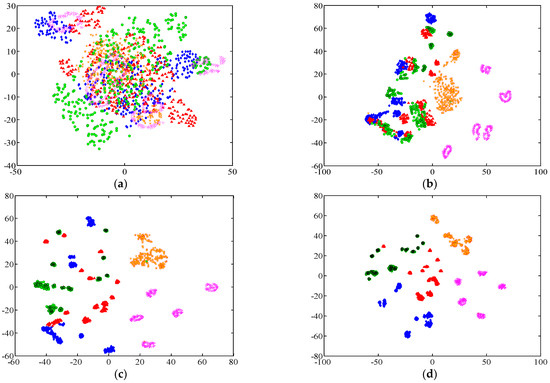 The feature learning of B-AlexNet was investigated by employing t-SNE, and the results are shown in Figure 28. The features in raw input are presented with scattered points. It was difficult to find a certain principle between features of different faults. Gradually, the features of the same fault type got together in clusters due to the learning of convolutional layers. Five categories were clearly observed through the subsequent fully connected layers and classifier layer. B-AlexNet could gain useful knowledge in the time–frequency representations and achieve the classification of five typical states of an axial piston pump.