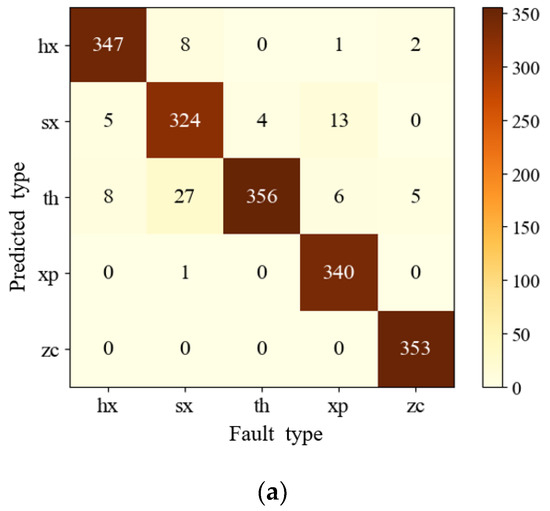 The hyperparameter combinations obtained by BO were used for model verification. As can be seen from the training loss curve in Figure 26, the model had good convergent results. The accuracy trend of the train and test samples showed a high degree of coincidence. The small difference indicated good stability of the B-AlexNet model. The confusion matrix of one experiment and the classification precision are depicted in Figure 27 and Table 7, respectively. The identification effects of I-AlexNet and B-AlexNet were superior to that of T-AlexNet, and the precision reached up to 100%. The B-AlexNet especially showed an improvement for sx and hx compared to T-AlexNet.