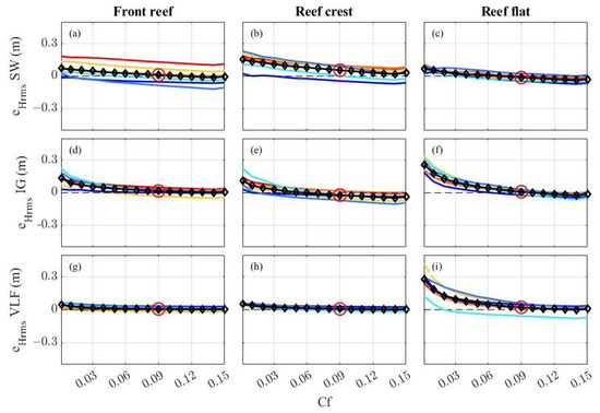Measured versus predicted hydrodynamic parameters and TWL depending on the bottom friction coefficient (). Error between measured Hrms/modelled Hrms, (a,d,g) on the front reef position, (b,e,h) on the reef crest position, and (c,f,i) on the reef flat and (a–c) for SW band (eHrmsSW), (d–f) for IG band (eHrmsIG), and (g–i) for VLF band (eHrmsVLF). (j) Measured/modelled wave-setup () in the reef flat. (k) Camera-derived total water level (TWL) against modelled TWL. On graphs (a–j) only the 6 events extracted from field measurements are plotted. On graph (k) the 16 storms extracted from the whole camera dataset are also plotted. The bold black line with diamonds represents the mean error on all storms for each value modelled. The red circle on each plot indicates the value (0.09) chosen after calibration.