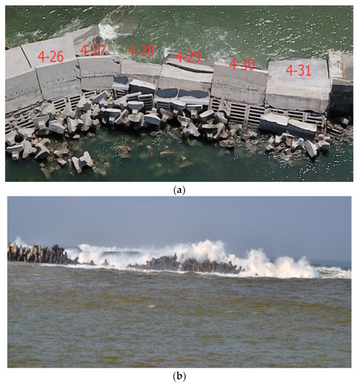 Site damage and instability of breakwater: (a) damage of transition zone of different structures of breakwater; (b) damage of breakwater head with the same structure.