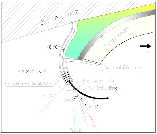 Based on the Shandong Rizhao Bay breakwater project [35], in order to achieve coordination between the port and the city, it was proposed to restore the 1882 m (Note: prototype size is the same below.) shoreline of the port coal yard as the ecological coast of the artificial beach. At the same time, in order to resist the erosion of the artificial beach by strong waves from the open sea, an 885.4 m sand retaining breakwater will be built. The project’s layout is shown in Figure 2.
