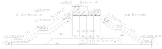 Figure 3 shows the structural section at the transition of breakwater. The dimensions of caisson are 18.66 m (long) × 16.86 m(width) × 19.5 m (height); the top elevation is +8.5 m; the underwater terrain elevation of the breakwater transition area is between −15.0 m and −19.0 m; an 8T Accropode is being used for the slope structure armor block; and a 2T Accropode is being used for the port side.