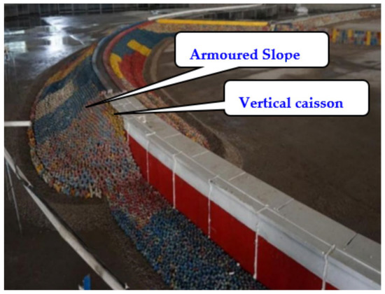 Influenced by factors such as an increase in the water depth, the deterioration of wave conditions in offshore construction, and restrictions on the exploitation of backfill stones, designs propose the adoption of two different structural combinations of vertical caissons and breakwater at appropriate water depths [1,2,3]. However, in recent years, as the intensity of extreme sea conditions increases at the transition of two structures, accidents regarding breakwater instability have occurred [4,5]. Figure 1a shows a breakwater transition in Guangdong Province of China that was damaged in a typhoon, causing huge economic losses to the enterprise [6]. As seen from the damaged site of the project in Figure 1, breakwater transition failure was different from that of other regions. Figure 1a shows the caisson sliding at the breakwater transition and the Accropode rolling down to the upper part of the caisson, resulting in the mixing of different structures; Figure 1b shows the instability of the armor block. The main differences between the two types of breakwater instability are as follows: ① the hydrodynamic characteristics are different, as the former has wave energy concentration and backwater; ② the connection of the armor block is different, as while the former consists of two different structures joined by a poor connection, the latter is normal.