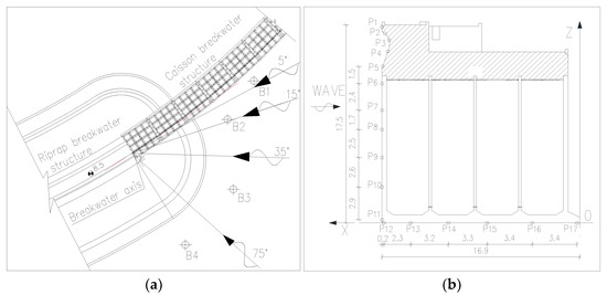 In order to monitor the wave height change caused in the transition zone of the breakwater by the wave energy concentration and the backwater, four wave height sensors (B1–B4) were arranged, as shown in Figure 5a.