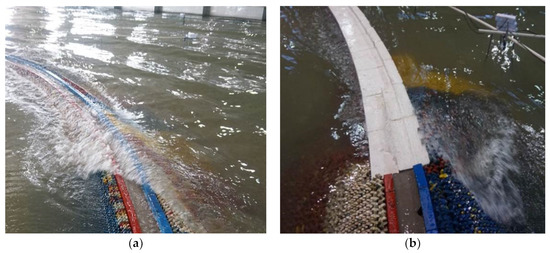 Based on the special position of the transition of the breakwater, the internal concave angle was formed by two structures. When the waves were incident at different angles, complex hydrodynamic conditions, such as the obvious wave energy concentration, backwater, overtopping, and a whirlpool, formed, as shown in Figure 6.