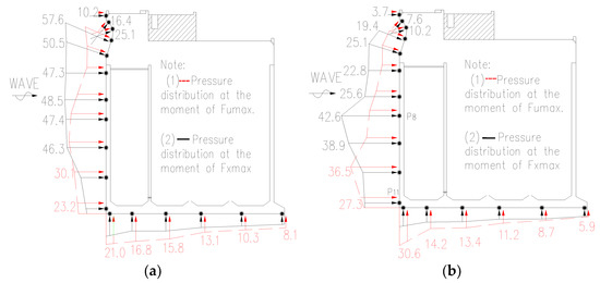 According to the statistics of the pressure distribution law of each measuring point, there was a phase difference in time when each measuring point was subjected to the maximum pressure during the wave action. At the same time, the pressure generated at each measuring point, corresponding to the time when the caisson was subjected to the maximum wave force, was not necessarily the maximum pressure. In order to further understand the relationship between the force and the pressure, the caisson subjected to the maximum wave force at the 75° wave condition was selected. The statistical relationship between the two is shown in Figure 7 and Figure 8. The following can be observed from the figure: ① most of the pressure between the force and the pressure occurs at different times, and the synchronization rate was less than 5%; ② at the moment of the maximum horizontal force, the pressure at measuring point P4 was the largest, with a = 57.58 kPa, the buoyancy force at the bottom of the caisson was the largest, at measuring point P12, with a = 30.22 kPa, and the pressure distribution at the whole bottom was trapezoidal.