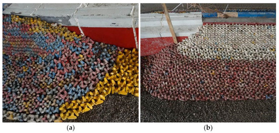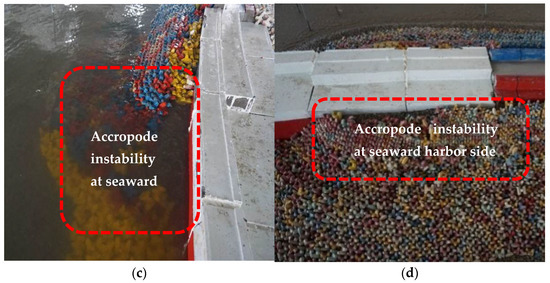 Comparison of the stability of the armor block before and after the test. (a) Block placement before testing at sea side; (c) Instability of block after testing at sea side; (b) Block placement before testing at harbor side; (d) Instability of block after testing at harbor side.