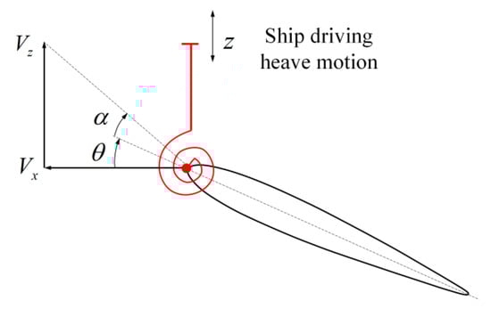 As shown in Figure 2, when the flapping foil propulsion is driven by the heave direction driven by the hull, the heave speed Vz is generated, and the forward speed Vx of the flapping foil is almost the same as the ship’s speed V. Consequently, the heave motion together with the advance velocity will create an oscillating hydrodynamic force and moment causing the foil to work at an AoA α. Under the restraint of the torsion spring, it can work at a certain pitching angle θ.