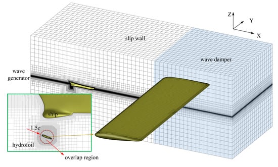 The setting method of boundary conditions is shown in Figure 3. The entrance boundary of the calculation domain is determined by the wave generator, and the exit boundary is determined by the wave damper. The surfaces on both sides and the upper and lower surfaces are set as slip wall boundary conditions. Both the hull surface and the hydrofoil surface are non-slip wall boundary conditions and numerical interpolation is used to transfer information at the interface of overlap grids region.