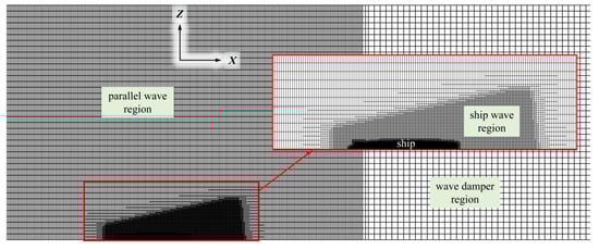 To reduce computation for the background mesh, a hexahedron mesh with local successive refinement method was chosen for the computational domain to keep just some local region as a refined mesh, as shown in Figure 3. In order to accurately simulate the changes of the wavefront around the hull and the separation and wake vortex of hydrofoil, mesh refinement is carried out on the free surface, hull and foil’s surface, and in the ship wave region, respectively. The enlarged detail grid of the free surface and ship wave region is shown in Figure 4, which is the top view of local successive refinement of the grid near the free surface. As shown in Figure 4, the mesh of wave damper region is not refined, and the refined mesh sizes of the hull surface region, the parallel wave region, and the ship wave region are different. In addition, as can be seen from Figure 3, additional refinement is performed in the overlap grid region around the foil and the hydrofoil edge region. The refined mesh size of different regions are shown in Table 2, and the reference dimensions are wavelength λ, wave height H, and hydrofoil chord length c. The refined near-wall mesh could ensure the wall y+ value on the hydrofoil surface is about 1.0, and the wall function approach is used for the near wall treatment on the hull surface; the value of wall y+ on the hull surface is about 10.