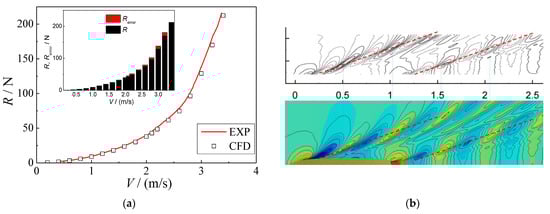 Comparison between DTMB5415 experimental results [] and CFD results. (a) Resistance of DTMB5415 ship model. (b) Wave elevation contours of DTMB5415 ship model at Fr = 0.28.