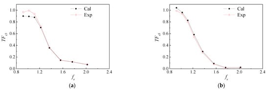 and under different encounter frequencies are compared, as shown in Figure 6. The detailed definitions of the two motion response parameters can be found in the literature []. From the comparison results, most of the calculated results are in good agreement with the experimental results except for individual working conditions under low frequency.