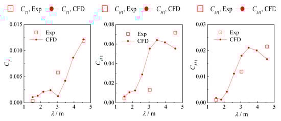 Subsequently, the test results of force and moment on the hull for three wavelengths in the work of Gui [] are compared with our simulation results. CT, CH, and CM are resistance coefficient, heave force coefficient, and pitch moment coefficient, respectively. The definitions of these coefficients could be seen in literature [] for details. The comparison results are shown in Figure 7. The overall trend of the comparison results of the three parameters is relatively consistent, with good coincidence at the minimum wavelength, followed by the maximum wavelength, and the worst coincidence at the middle wavelength. It is speculated that this is due to an increase in ship motion response with an increase in wavelength. At the same time, it is also considered that less data of the experiment may also affect the comparison, which needs further comparative research with the experiments in the future.