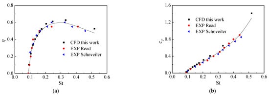 Comparisons of propulsive efficiency η and thrust coefficient cT with previous computational and experimental results [,] (the black curve ■ is the CFD results of this paper; the red dot ● is the result of Read experiment; the blue triangle ▲ is the result of Schoveiler experiment). (a) Propulsive efficiency η. (b) Thrust coefficient cT.