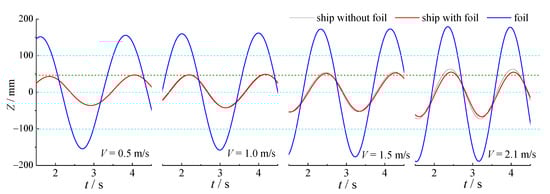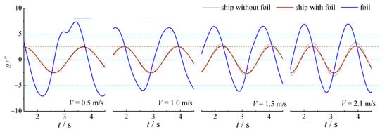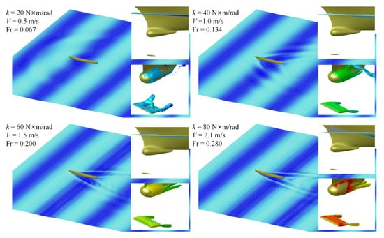 Figure 10 shows the simulation of the hull and self-pitching bow foil in head waves at four speeds, including total free-surface elevation of the ship model and the motion of the bow foil. The torsion spring stiffness adopted at each speed may also be observed in Figure 10. The time selected in each figure is the time when the bow foil reaches the maximum pitch angle under the corresponding working conditions. With the corresponding spring stiffness, the maximum pitch angle of the foil under the four working conditions is close. The pitch angle ranges from 6 to 7.5 degrees.